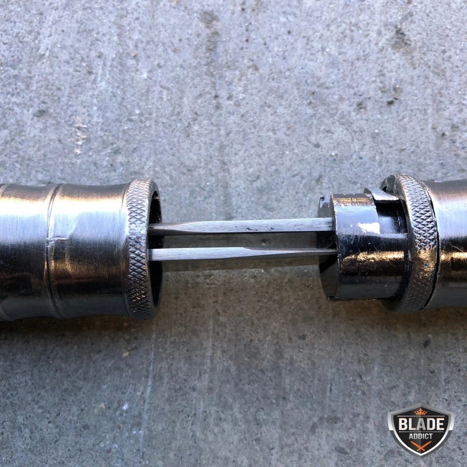 Experience the complete dynamism and elegance with the 2PC 25” Double Blade Interlocking Samurai Ninja Sword Set. If you are a martial artist, sword collector, or someone who just loves swords and good-quality weapon, then this set of swords is the best for you. Lacing two spear point blades along with an interlocks system this set is perfect for display, cosplay, or as training knives.