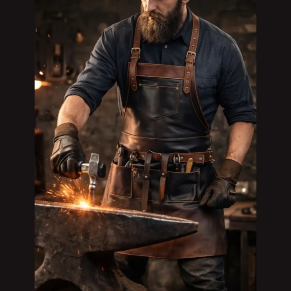 This leather forge apron is suitable for blacksmiths, welders, metal artisans, and workshop hobbyists. It offers dependable coverage and convenience for hands-on craft work.